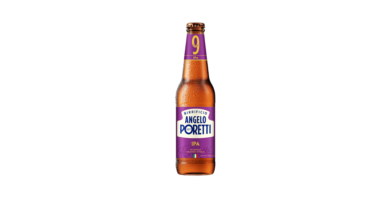 1Cfz. x 24Pz Birra Poretti 9 Luppoli IPA 33cl, bottiglia dal design accattivante con etichetta viola, ideale per chi cerca un’IPA intensa e distintiva da proporre in tabaccherie e bar.