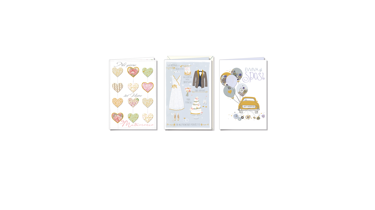 1Cfz.x12Pz. Biglietti matrimonio eleganti con dettagli in rilievo oro e immagini raffinate, ideali per celebrare nozze con un augurio speciale in tabaccheria e bar. Formato 11,5x17 cm, perfetti per ogni punto vendita.