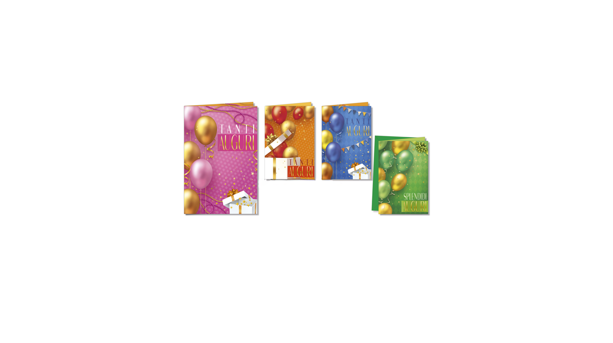 1Cfz.x12Pz. Biglietti di compleanno dal design moderno con palloncini, torte e dettagli dorati, ideali per un augurio festoso e d’impatto. Perfetti da esporre in tabaccheria o bar grazie ai colori vivaci e alle grafiche accattivanti.