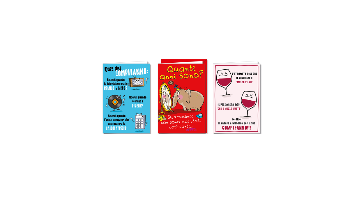 1Cfz.x12Pz. Biglietti di compleanno dal design allegro e spiritoso, con illustrazioni in stile fumetto ideali per regalare un sorriso; formato 11,5x17 cm, perfetti per tabaccherie e bar.