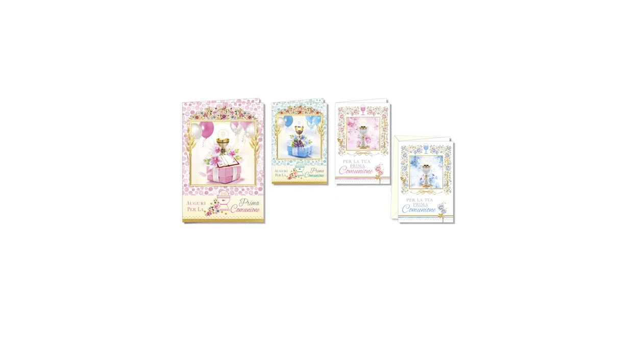 1Cfz.x12Pz. Cromo Biglietti Comunione Fustellati: eleganti biglietti sagomati con calice dorato e motivi floreali, ideali per celebrare la Prima Comunione con un augurio raffinato. Perfetti per arricchire l’offerta di biglietti festivi in tabaccheria e bar.