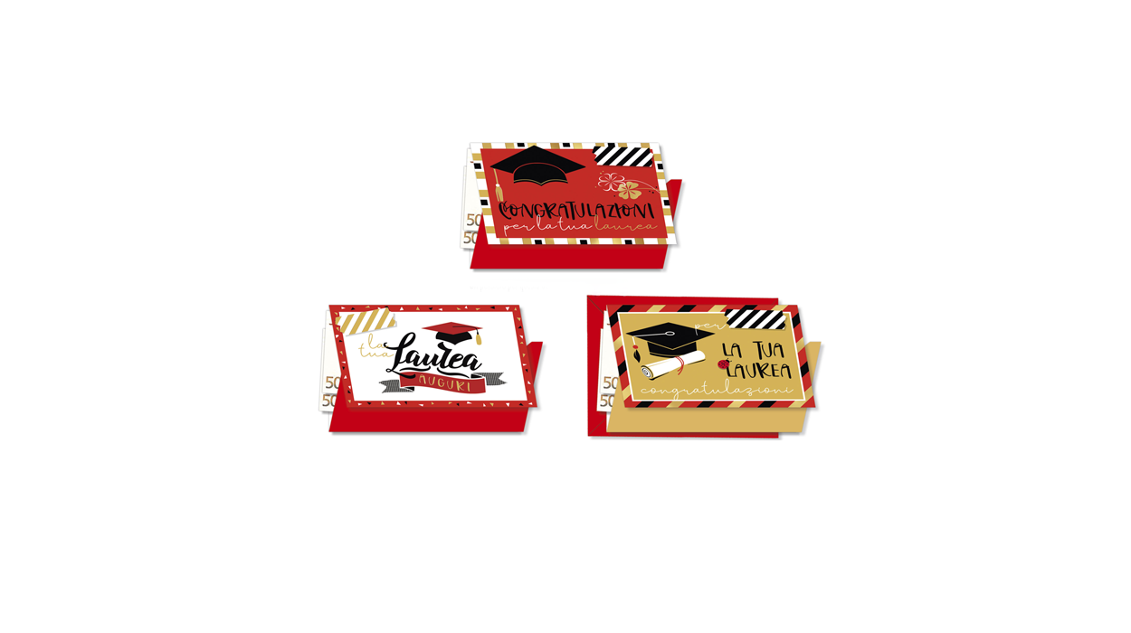 1Cfz.x12Pz. Biglietti portasoldi per laurea con grafiche eleganti, dettagli dorati e messaggi di auguri, ideali per un regalo celebrativo. Un prodotto raffinato e pronto alla vendita in tabaccherie e bar.