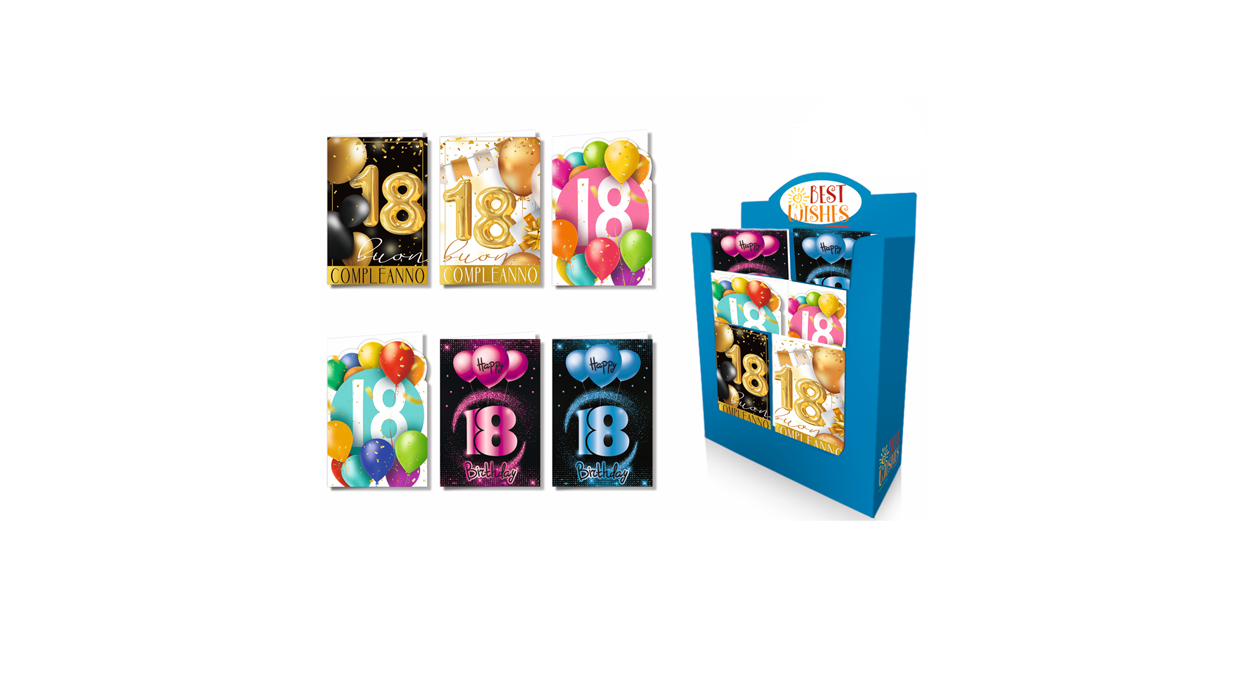 1Cfz.x36Pz. Display assortito di biglietti augurali per il 18° compleanno, con grafiche colorate e design accattivanti, ideale per bar e tabaccherie che vogliono offrire un prodotto dedicato a questa ricorrenza speciale.