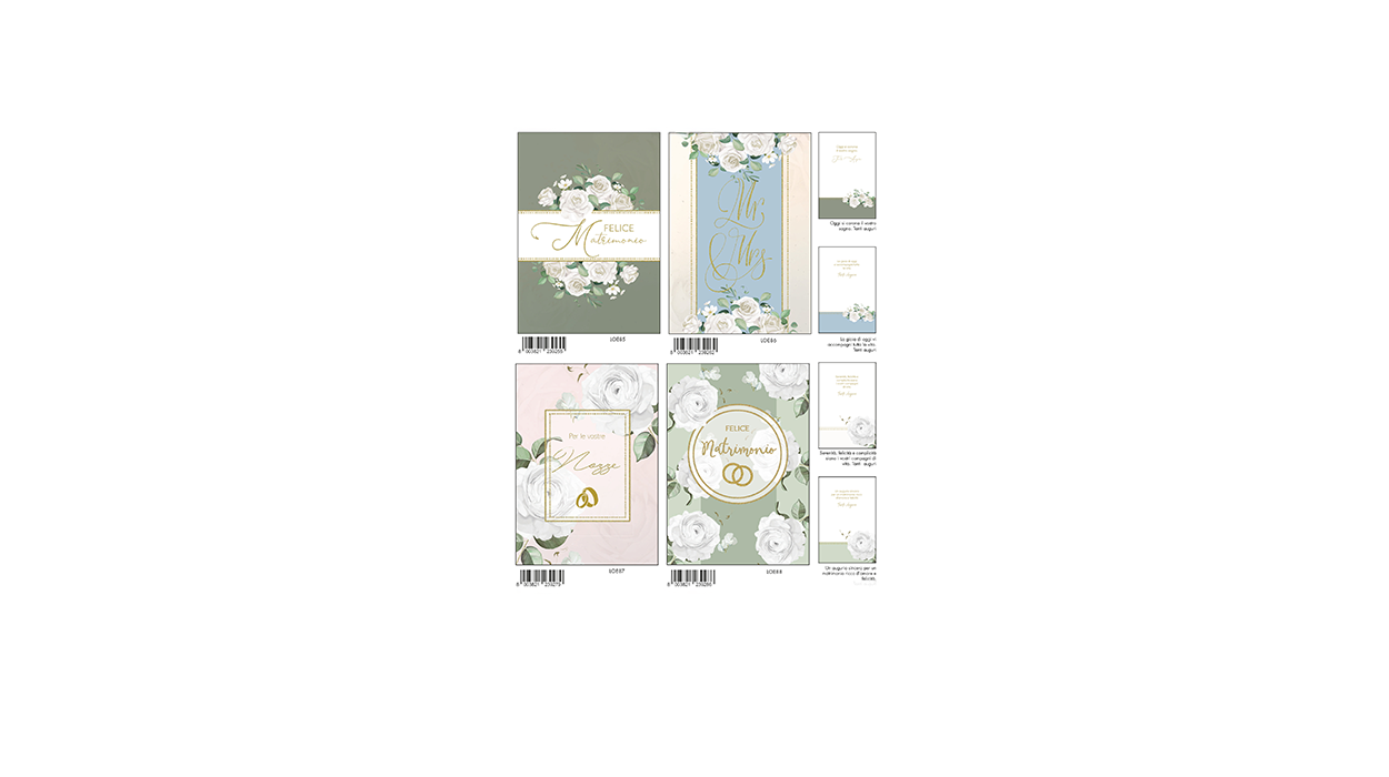 1Cfz.x12Pz. Biglietti nozze eleganti con grafiche raffinate: fedi, bouquet di rose, decorazioni floreali e torta nuziale su sfondo colorato. Ideali per celebrare matrimoni con un messaggio augurale distintivo.