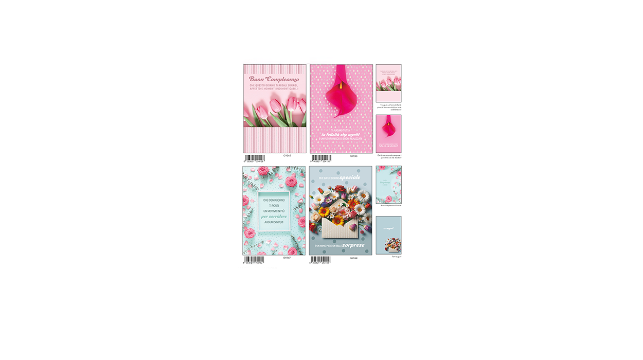 1Cfz.x12Pz. Biglietti di auguri con eleganti grafiche floreali e dettagli dorati, ideali per celebrare il compleanno con un tocco raffinato. Formato 11,5x17 cm, perfetti per esporre in tabaccheria e bar.