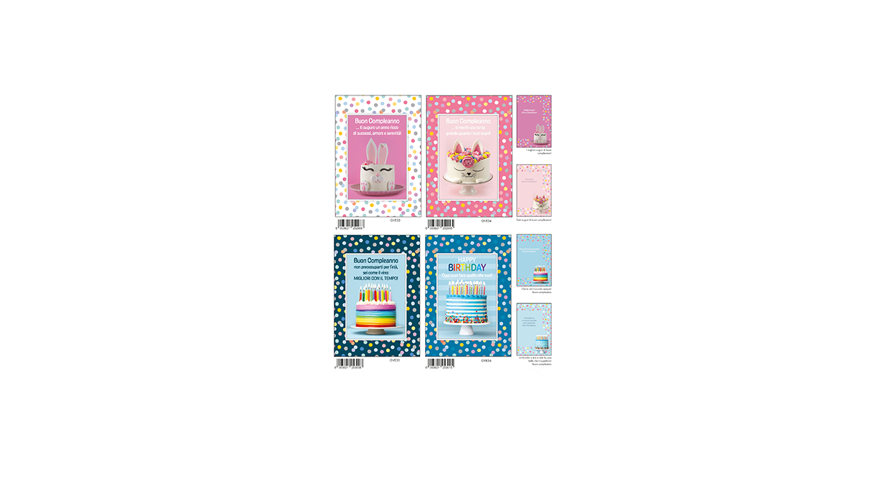 1Cfz.x12Pz. Colorati biglietti di auguri con grafiche di torte, candeline e palloncini, ideali per festeggiare ogni compleanno con un tocco allegro. Formato 11,5x17 cm, perfetti per completare la proposta regali di tabaccherie e bar.