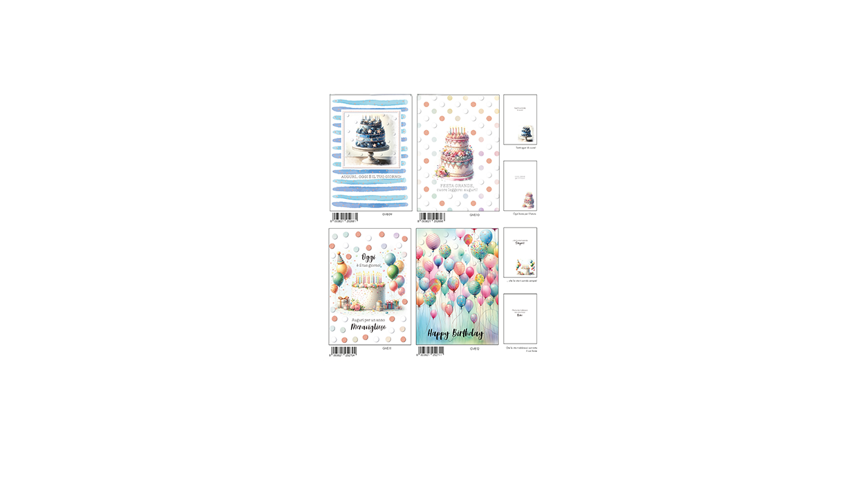 1Cfz.x12Pz. Biglietti di compleanno moderni e colorati, con grafiche eleganti e dettagli dorati, ideali per esporre in tabaccheria o bar come proposta regalo pronta all’uso.
