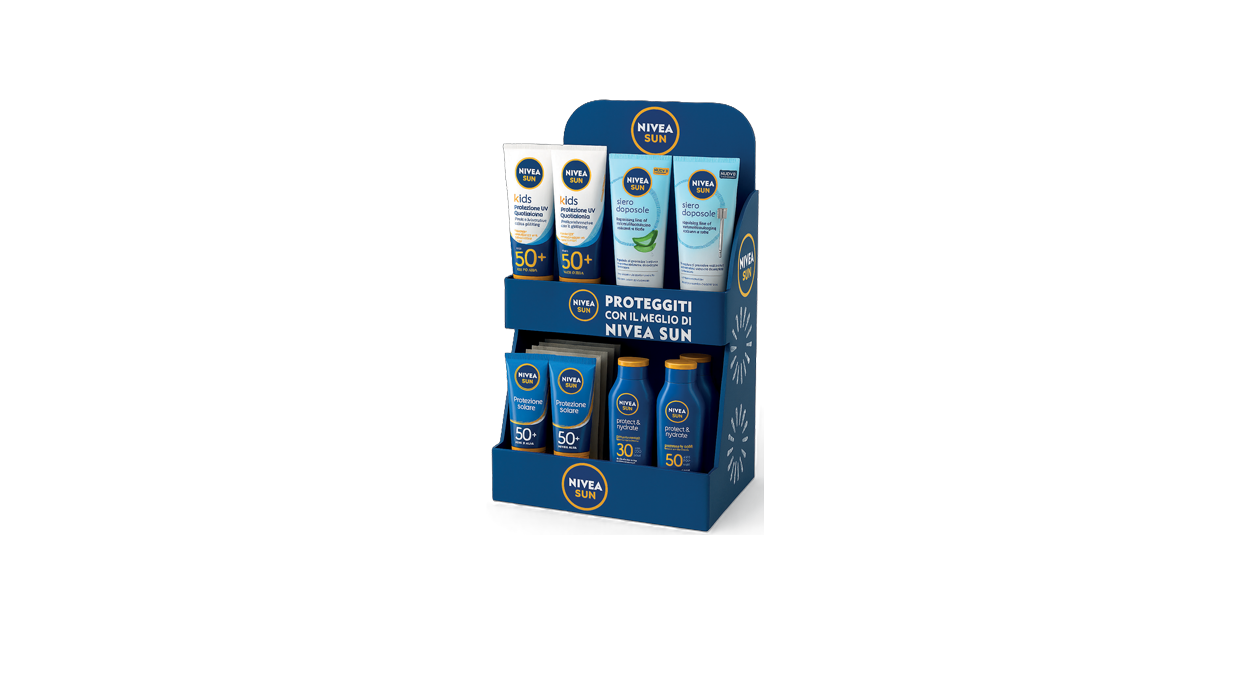 1Cfz. x 30Pz. Latte Solare P&H SPF30 100ML (6Pz.) Latte Solare P&H SPF50+ 100ML (6Pz.) Latte Solare Kids P&C PF50+ 100ML (6Pz.) Latte Doposole Hydrate 100Ml (6Pz.) Crema Viso Louminous FP50 40Ml (6Pz.) Dimensioni Expo: Cm