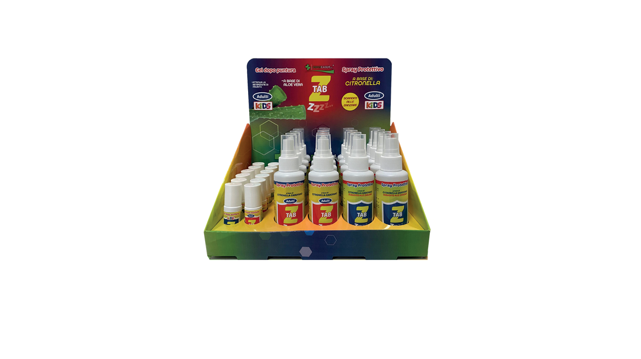 1Cfz. x 28Pz. Spray Antizanzare 100Ml (8Pz.) Spray Antizanzare Bambini 100Ml (8Pz.) Gel Dopopuntura 20Ml (6Pz.) Gel Dopopuntura Bambini 20Ml (6Pz.) Dimensioni Display:19x26,5x26,5Cm