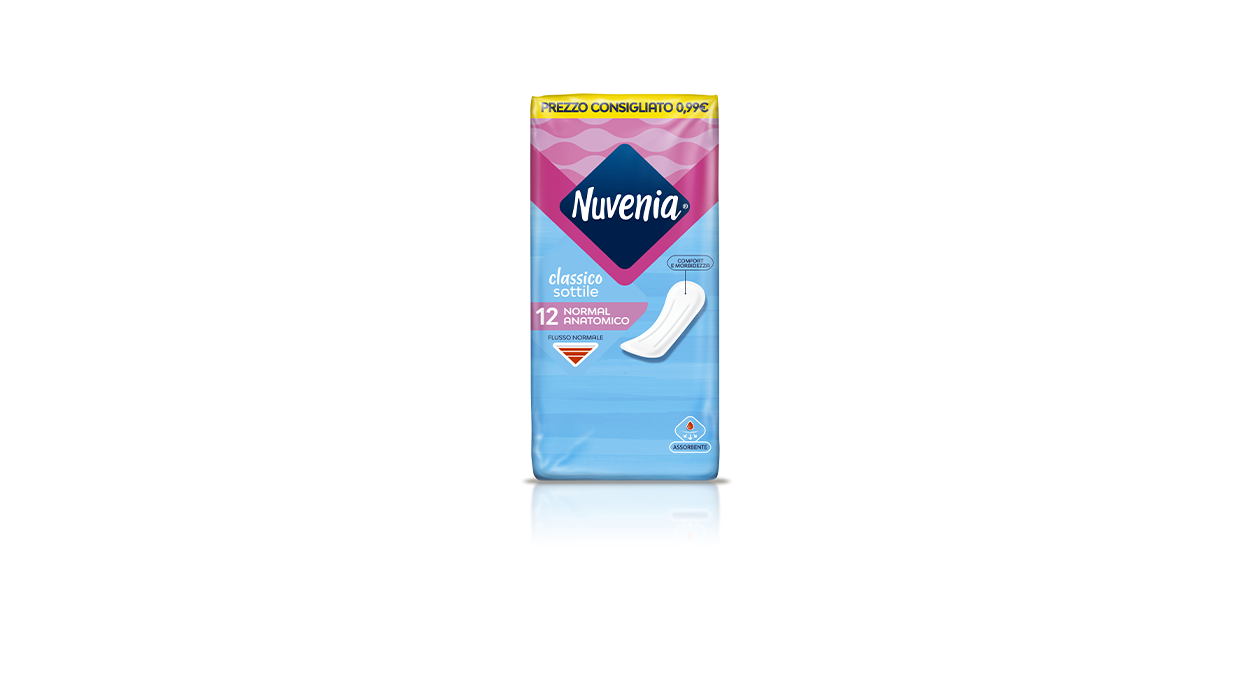 1Cfz.x18Pz. Nuvenia Assorbente Sottile Classico offre 12 pezzi per flusso normale in una confezione compatta, con prezzo consigliato in evidenza. Ideale per esposizione in tabaccherie e bar grazie al formato pratico e all’indicazione “comfort e assorbenza” ben visibile.