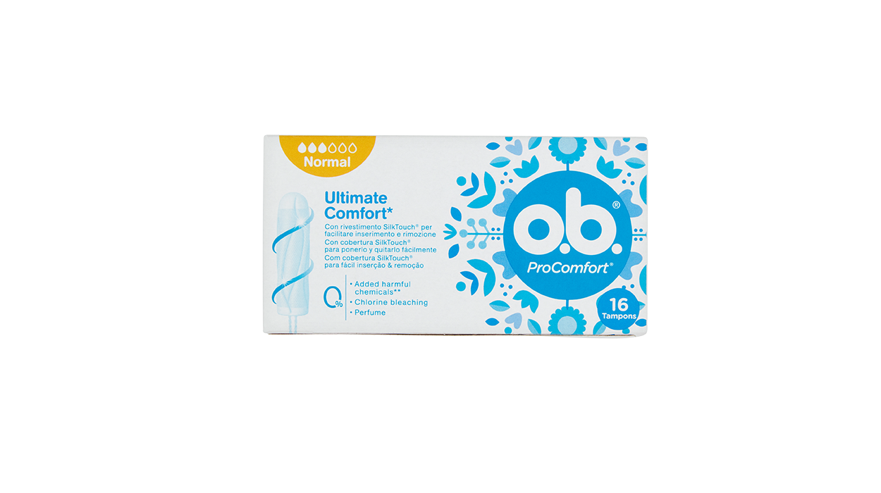 1Cfz.x6Pz. OB Assorbenti Interni Normal ProComfort, confezione da 16 pezzi, garanzia di comfort e protezione affidabile grazie alla tecnologia Dynamic Fit. Confezione compatta dal design blu, ideale per una rapida esposizione a scaffale.