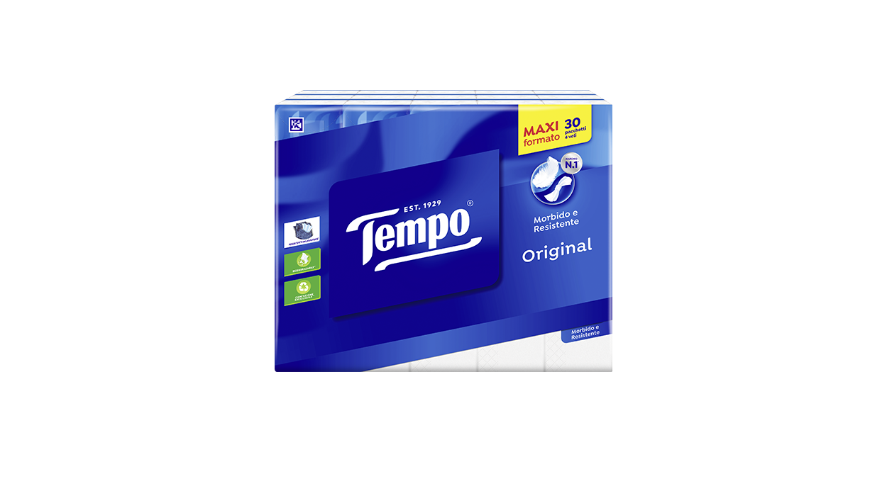 1Cfz.x300Pz. Tempo Fazzolettini Original maxi formato da 30 pacchetti, ideali per chi cerca fazzoletti morbidi e resistenti. Confezione compatta e pratica, perfetta per l’esposizione in bar e tabaccherie.