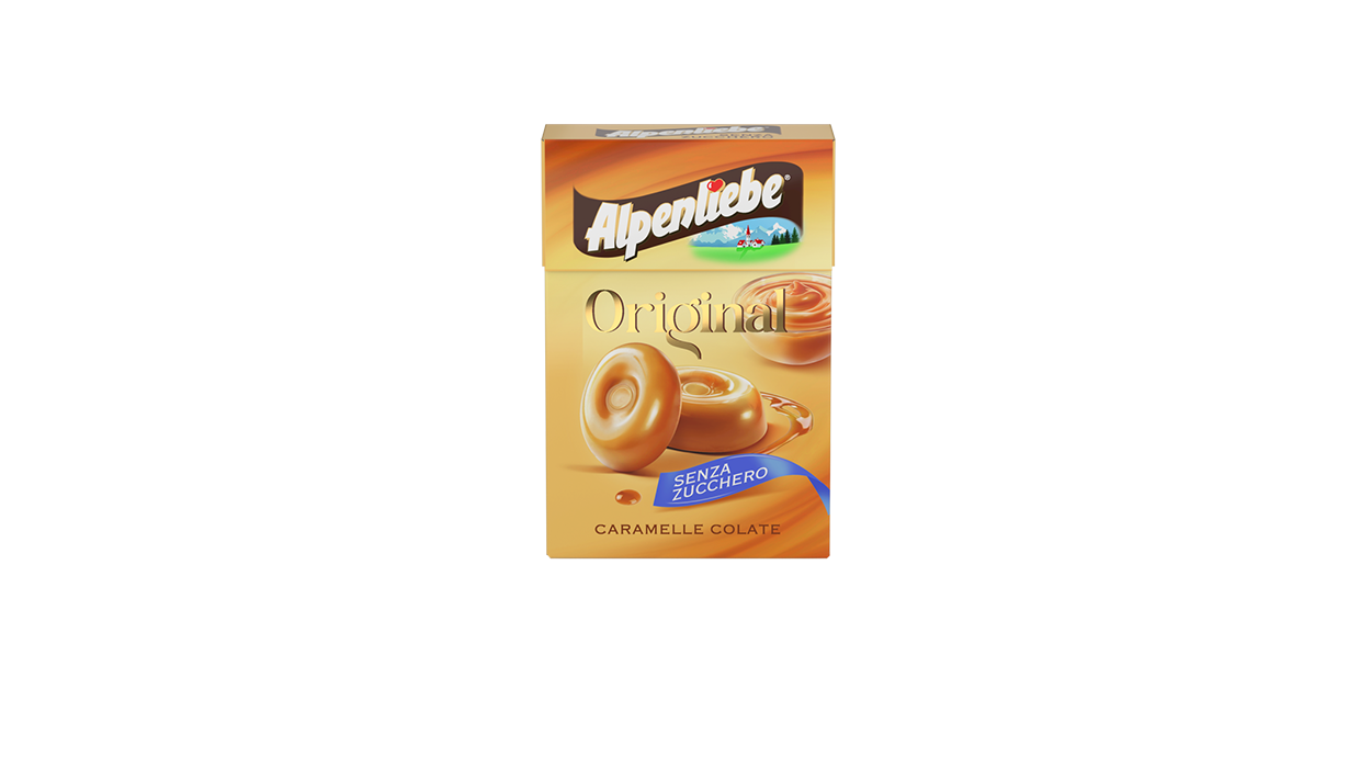 1Cfz.x20Pz. Astuccio compatto e colorato con caramelle colate Alpenliebe original, evidenziate come “senza zucchero” sulla confezione. Ideale per vendita vicino alle casse di bar e tabaccherie.