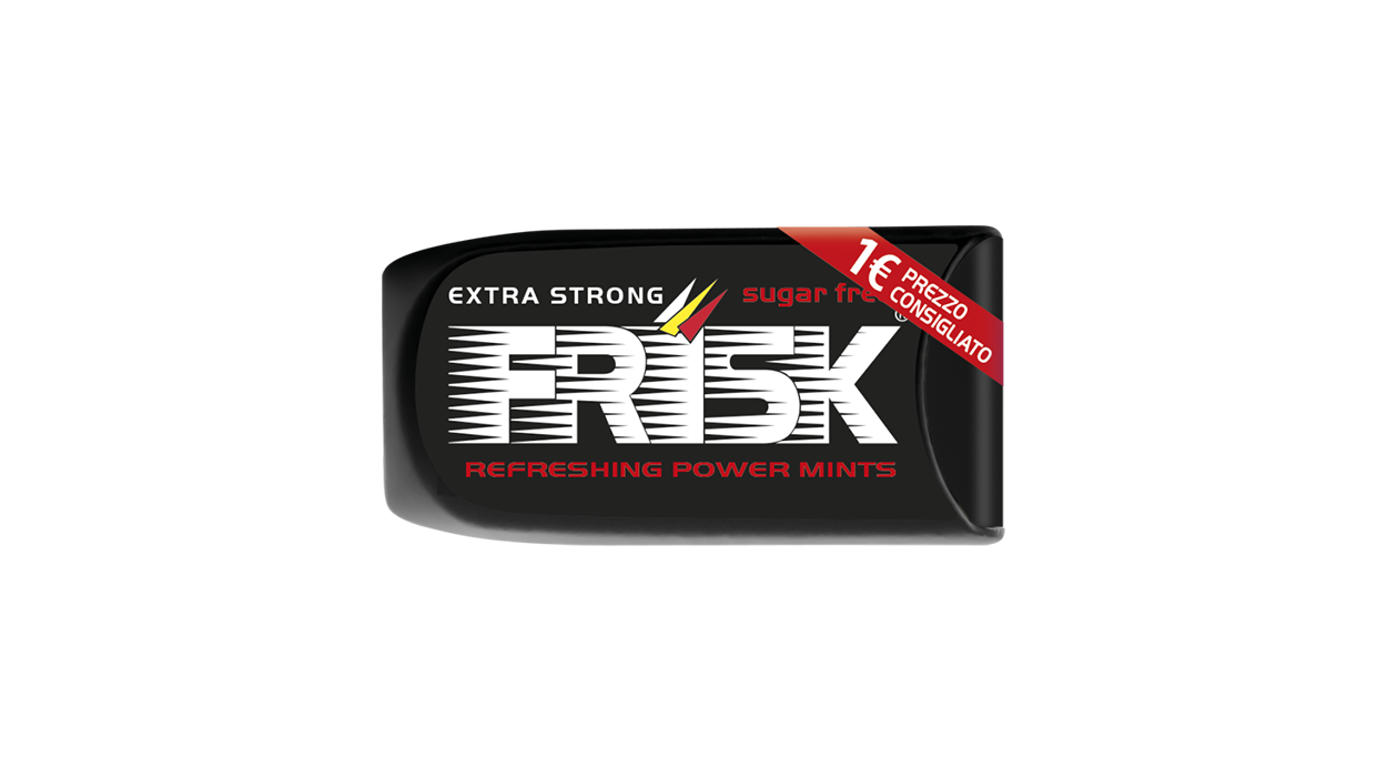 1Cfz.x12Pz. Frisk Extra Strong SZ è una pratica confezione nera dal design moderno, ideale per la vendita in tabaccheria grazie alla sua formula sugar free e al gusto intenso.