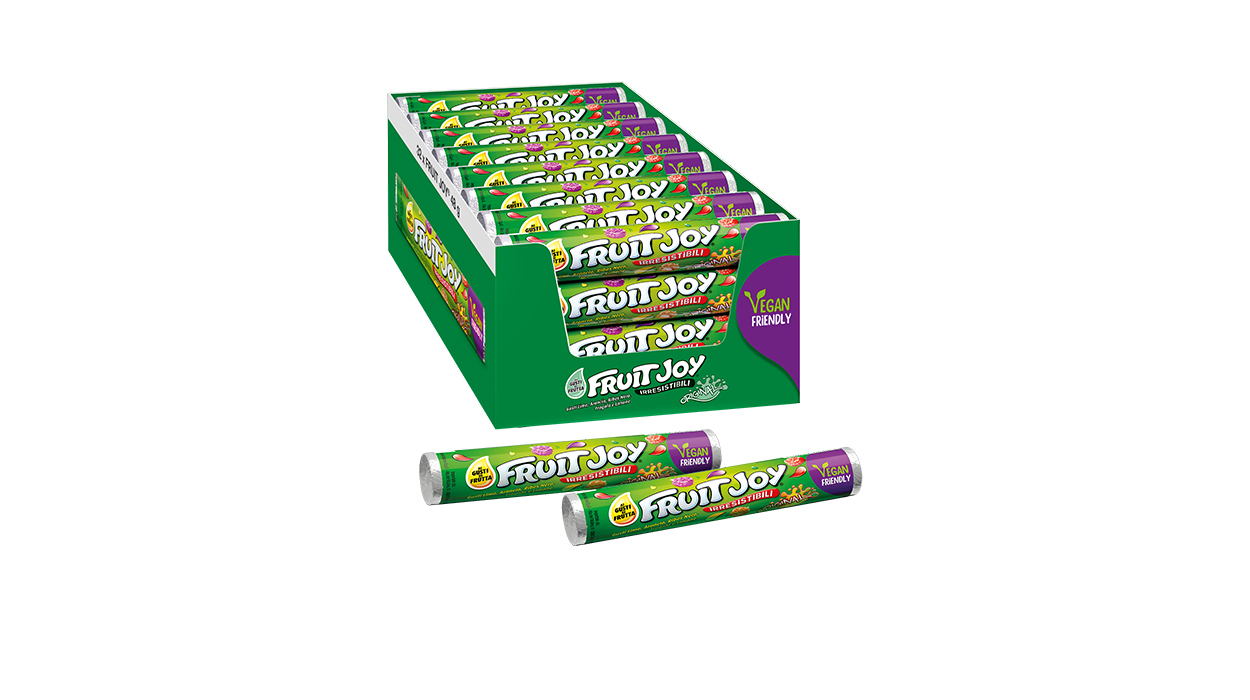 1Cfz.x32Pz. Fruit Joy Big Tube Stick 52,5G, con vivace confezione verde, offre caramelle in stick dal gusto fruttato con succo di frutta, perfette per un'esposizione accattivante vicino alla cassa.