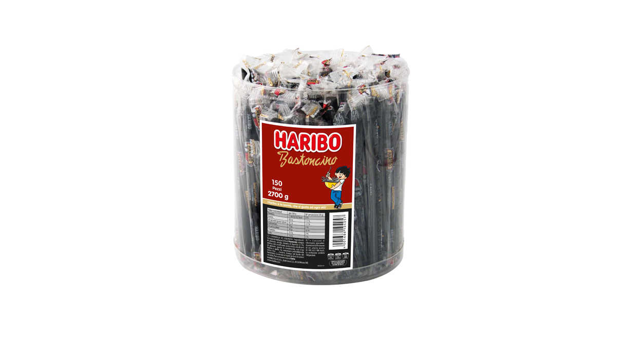 1Cfz.x150Pz. Il barattolo Haribo Bastoncino Liquirizia 18G offre numerosi bastoncini confezionati singolarmente, ideali da esporre sul bancone per una vendita veloce e igienica. Il packaging vivace attira facilmente l’attenzione, perfetto per tabaccherie e bar.