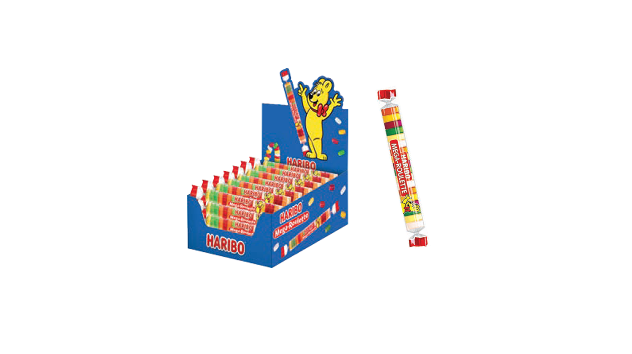 1Cfz.x40Pz. Haribo Mega Roulette 45G propone rotoli di caramelle gommose colorate, confezionate singolarmente, ideali per la vendita su banco in tabaccherie e bar. L’espositore compatto attira l’attenzione grazie al vivace design e al famoso orsetto Haribo.