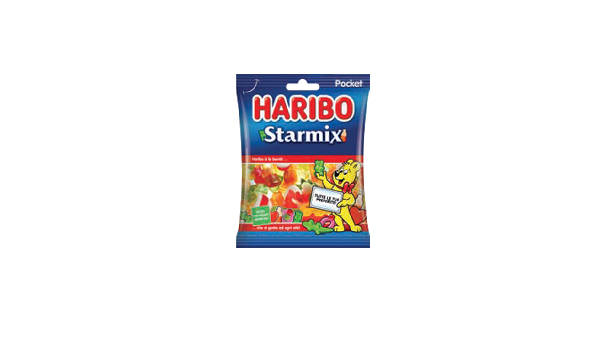 1Cfz.x30Pz. Haribo Starmix 80G unisce gelatine colorate e gommose di forme assortite in una confezione vivace e accattivante, perfetta da esporre nei punti vendita di tabaccherie e bar. Il pack richiama l’attenzione con il suo design blu e dettagli a tema spaziale.