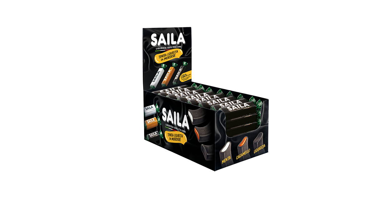 1Cfz.x200Pz. Saila Soffice Alla Liquirizia 19G offre caramelle morbide dal gusto intenso di liquirizia, proposte in un pratico espositore da banco ideale per tabaccherie e bar. L’incarto nero con dettagli verdi rende il prodotto facilmente riconoscibile e accattivante.