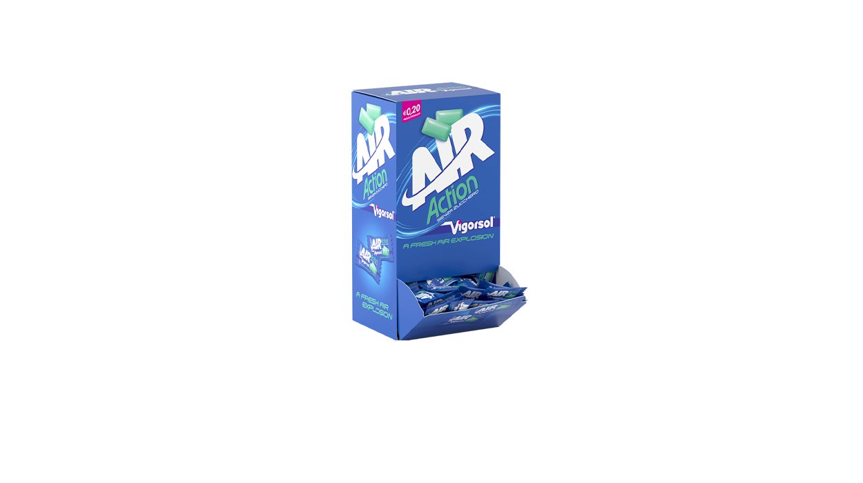 1Cfz.x250Pz. Air action Vigorsol è il chewing gum incartato singolarmente. Amato dai consumatori per la sua incredibile freschezza ed il suo gusto unico ed inimitabile.