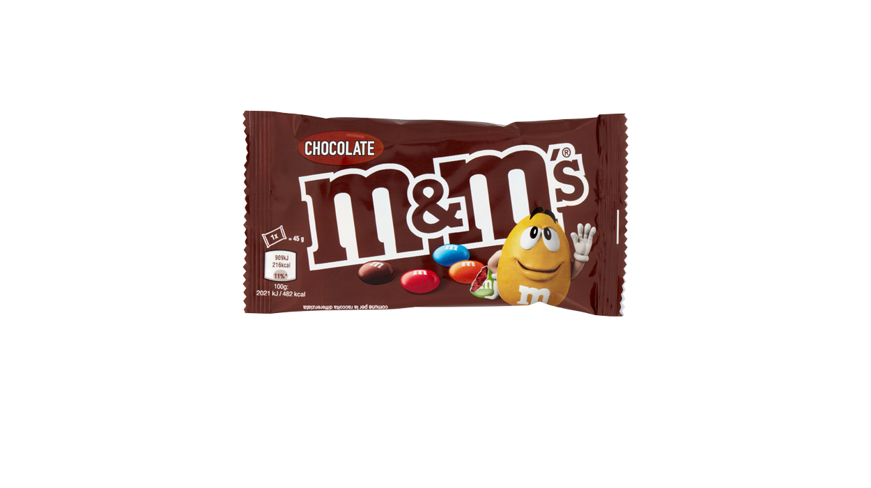 1Cfz.x24Pz. M&M'S Choco 45g è la confezione tascabile di confetti colorati ripieni di cioccolato, perfetta per vendite d’impulso in tabaccheria e bar. Il pack compatto e riconoscibile attira l’attenzione sullo scaffale.