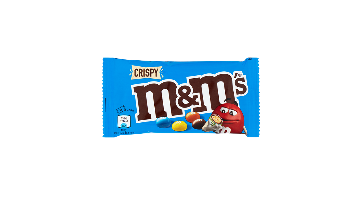 1Cfz.x24Pz. M&M'S Crispy Blu Busta 36g offre dragées colorate con ripieno croccante, ideali come snack veloce e pratico da banco. Il formato compatto si adatta perfettamente all'esposizione in cassa di tabaccherie e bar.
