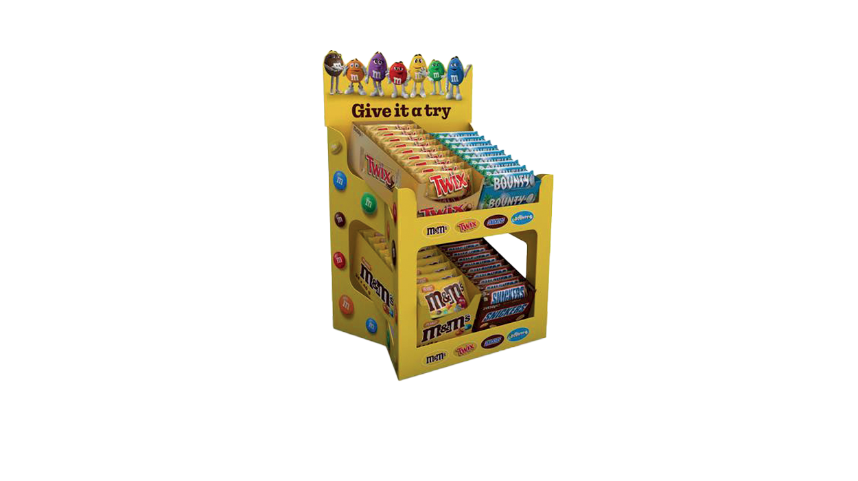 1Cfz. x 97Pz. Contenuto: M&M's Peanut 45G (24Pz.) Twix 50G (25Pz.) Snickers 50G (24Pz.) Bounty 57G (24Pz.) Dimensioni: 45x39x30Cm