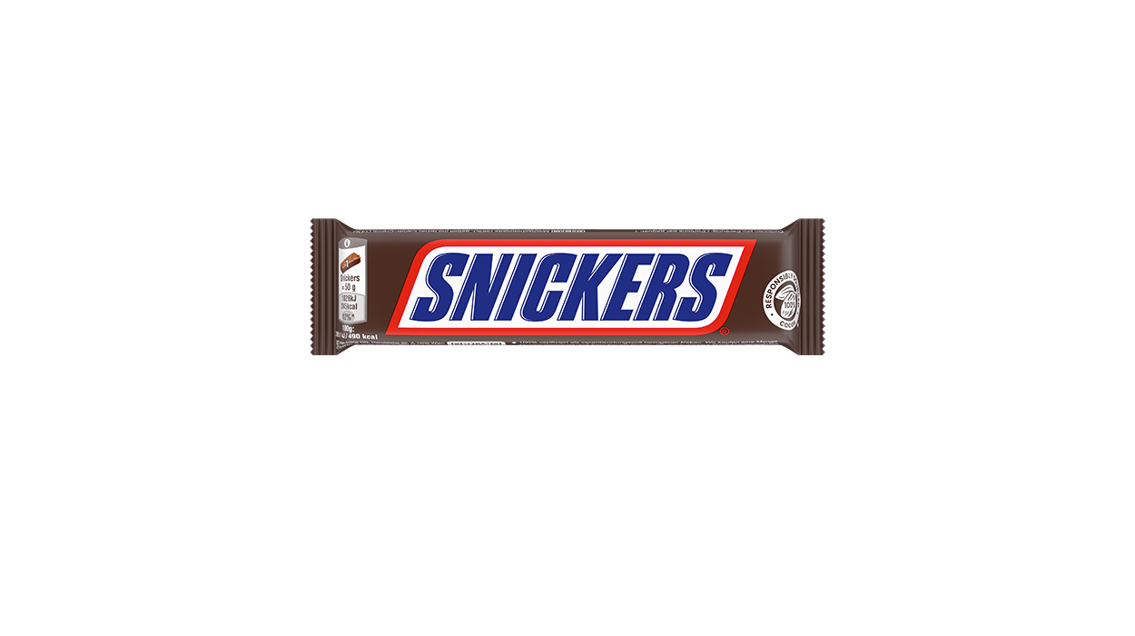 1Cfz.x24Pz. Barretta Snickers 50g dal classico incarto marrone, ideale per una pausa golosa grazie alla presenza di arachidi intere ben visibili sulla confezione.