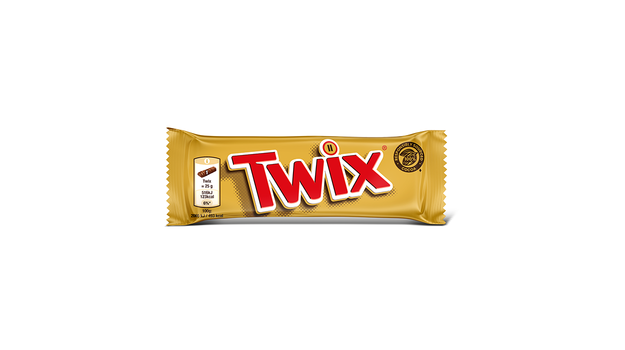 1Cfz.x25Pz. Barretta Twix 50g in confezione dorata, ideale per offrire ai clienti uno snack goloso al cioccolato pronto da gustare. Packaging riconoscibile con logo rosso e immagine del prodotto sul fronte.