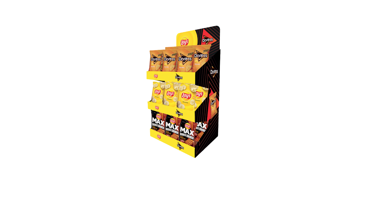 1Cfz. x 54Pz. Contenuto: Doritos Tex Mex 40G (18Pz.) Lay's Classiche 40G (18Pz.) Lay’s Max Double Crunch BBQ 40G (18Pz.) Dimensioni Expo: 38,6x37x66Cm