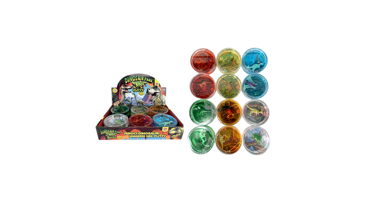 1Cfz.x12Pz. Dynit Putty Dinosauro propone divertenti dinosauri colorati da scoprire all’interno di confezioni trasparenti, perfetti per stimolare la curiosità dei più piccoli nei punti vendita. L’espositore da banco attira l’attenzione con grafiche vivaci e offre una soluzione ideale per bar e tabaccherie. 40,3x26x16 Cm
