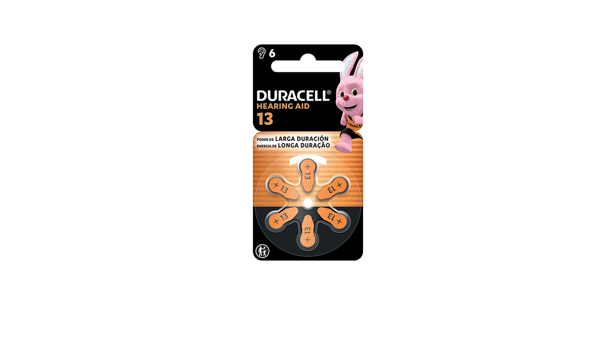 1Cfz.x10Bl. Duracell Hearing Aid Pila 13 Arancio da 6 pezzi, con linguetta arancione ben visibile e confezione compatta ideale per espositori in tabaccheria e bar. Prodotto pensato per apparecchi acustici, con indicazione di maggiore potenza sulla confezione.