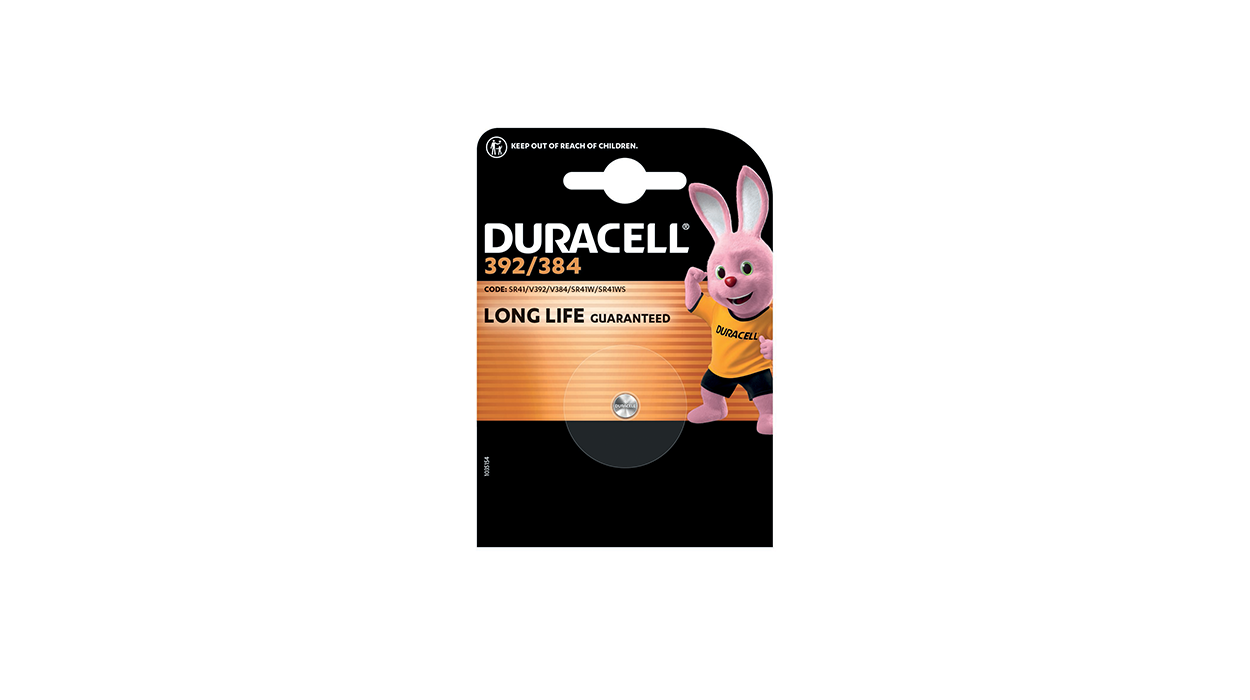 1Cfz.x10Bl. Pila a bottone Duracell Watch 392/384, confezione singola, ideale per orologi e dispositivi elettronici di precisione. Il packaging compatto con il logo Duracell garantisce affidabilità e visibilità a scaffale.