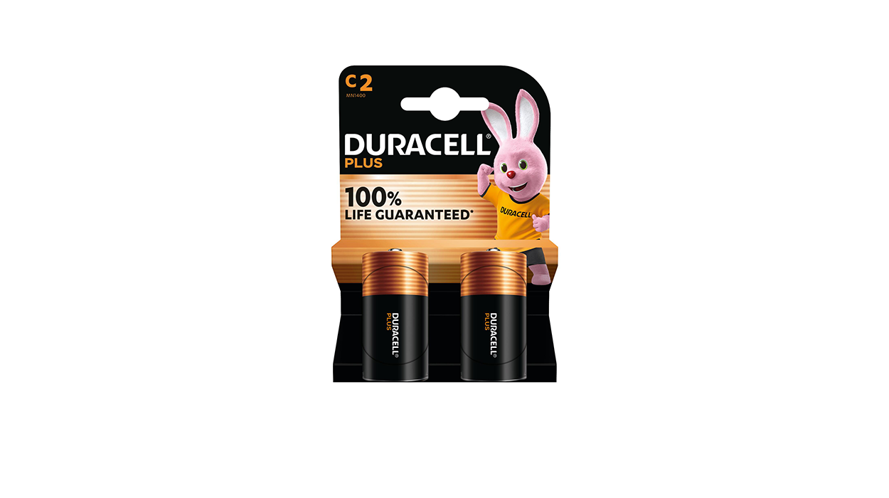 1Cfz.x10Bl. Duracell Plus 100 Pila 1/2 Torcia C, confezione da 2 unità, garantisce affidabilità grazie al classico design nero e rame e al riconoscibile packaging con il coniglietto rosa. Soluzione ideale per dispositivi a uso quotidiano in bar e tabaccherie.